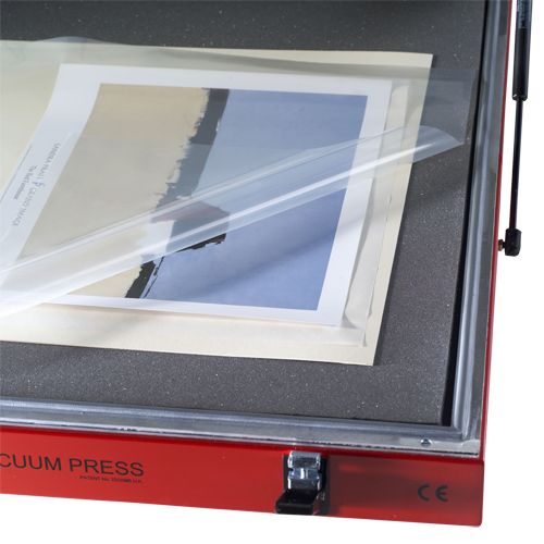 The Drytac 35" x 47" Hot Press Heated Glass Top Vacuum Press handles a wide range of presentation materials from foam board and wood to photos, art prints and delicate fabrics and is is well regarded by picture framers, photolabs, digital service bureaus and other finishing professionals for their ability to produce a very even spread of heat across the work surface, leading to a superior quality of surface finish. It features an automatic electronic timer with a manual override switch and vacuum pressure adjustment capabilities. Upon completion of the cycle, vacuum pressure is automatically released and the timer resets itself. The top panel of the Drytac 35" x 47" Hot Press Heated Glass Top Vacuum Press is made up of two sheets of reinforced tempered glass. The inner surface of the lower sheet has an invisible conductive film embedded in it. A controlled electric current is passed through this conductive film creating a highly efficient heating system. A sensor on the glass monitors and controls the temperature by means of a digital thermostat. The glass is extremely smooth and scratch resistant. The transparent top panel allows the operator to view materials during processing and correct mis-aligned work or folded back corners.