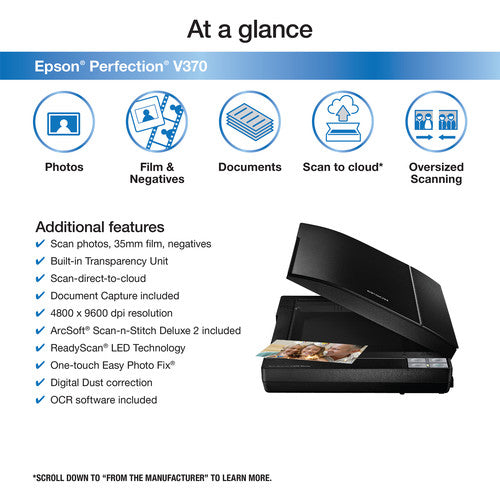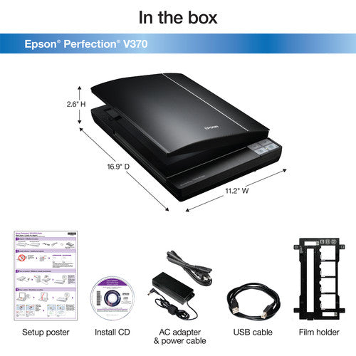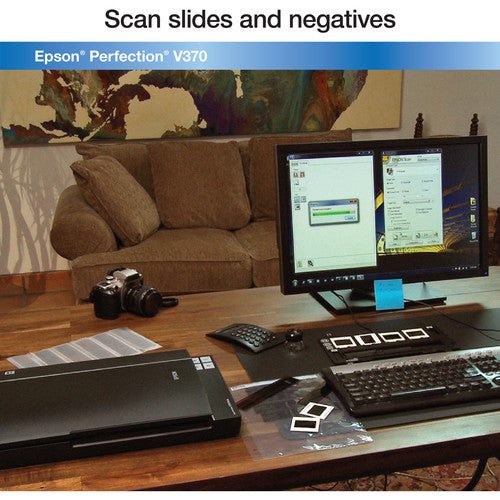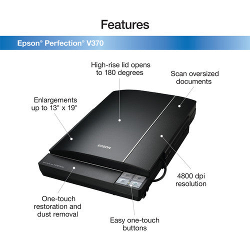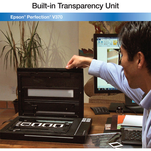 The Perfection V370 Scanner from Epson features a 4800dpi optical resolution and a CCD sensor with ReadyScan LED technology. The scanner's high resolution is ideal for scanning both photos and documents and its 48-bit color depth and 3.2 Dmax provide accurate color rendition for all your scans. In addition to scanning documents, the scanner features a built-in transparency unit and includes a film holder so you can scan 35mm film and slides as well. Easily convert your old negatives and slides to digital images you can see, edit, and reprint on your computer.