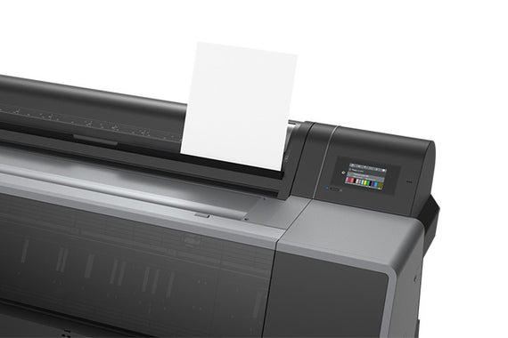 The unit features top-loading roll media support up to 44" wide and supports most photographic, fine art, and design media types up to 7" in diameter. Spindle-free media adapters are adjustable for both 2" and 3" core media and a built-in automatic rotary media cutter smoothly cuts most photographic and fine art media types. A front feeder for poster board media up to 1.5mm thick is also provided, and the unit supports single sheets up to 44" wide. For easy navigation, the printer comes with a customizable 4.3" color touchscreen, and the P9570 also offers easy workflow integration and is compatible with most third-party RIP workflow software.