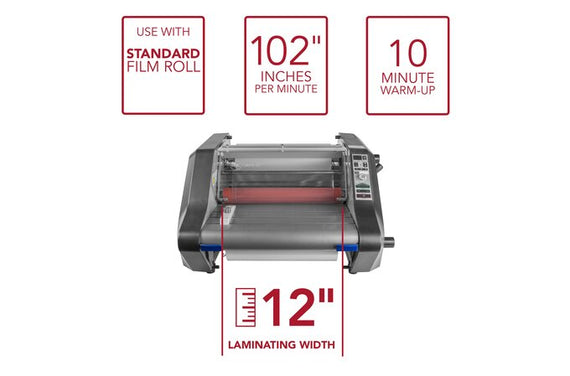 This New and Improved GBC Catena 35 has a faster lamination speed by up to 3.5ft/min compared to the old model, and can now accommodate 2.25" core laminating films (with optional core adapter). With its small footprint, this new and improved laminator encapsulates and mounts jobs up to 12" wide without taking up much space in your office, school or small print shop. Plus, its increased 1/4" mounting gap ensures that mounting to foam core is quick and frustration-free. Equipped with new easy to use features including an open design, pivoting table, AutoSpeed and programmable presets, the NEW Catena 35 is now simpler than ever to operate - even for first-time users. Ideal in laminating signage, charts, graphs, photos, menus, placemats,certificates, and POP displays. This New GBC Catena 35 12" Roll Laminator tackles your most demanding jobs with unmatched ease, versatility and efficiency. Old model number: 1715830.